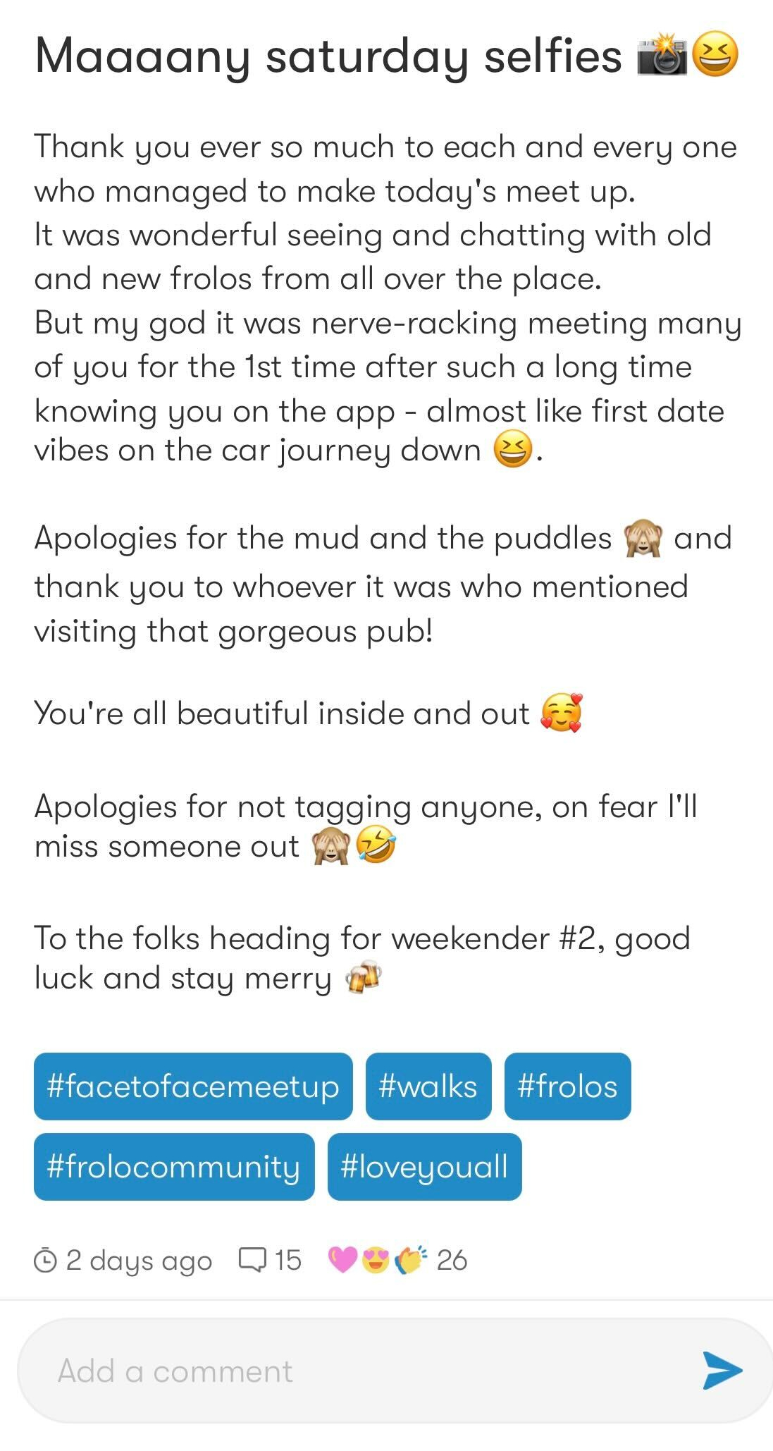 One of our Frolo Community Champions recently shared a post after hosting a Meetup, saying that the drive there gave her “first date nerves.” She’d been chatting to people in the app for ages, but meeting everyone in person still felt like a big step.
